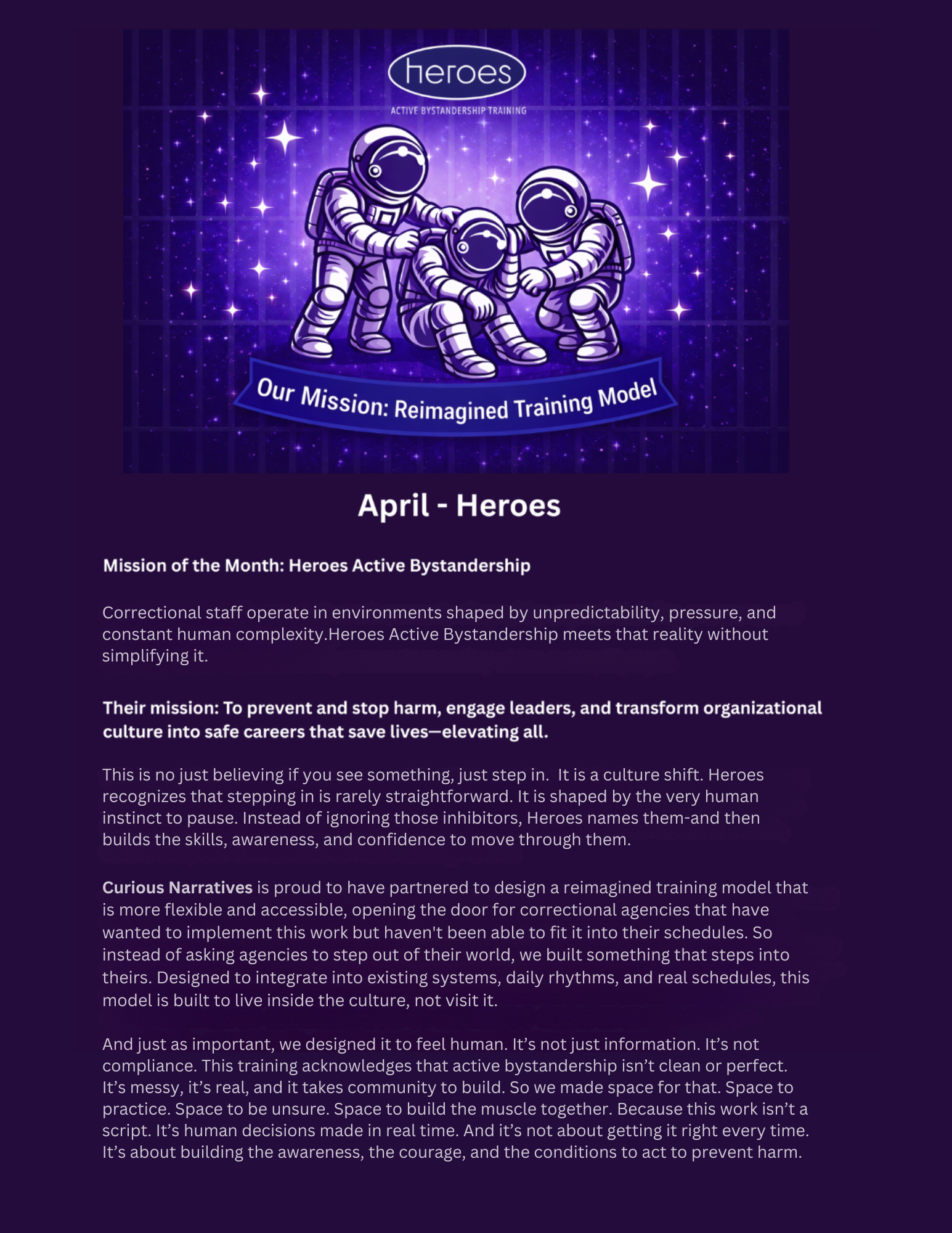 "Thoughtful, conscientious, organized, and incredibly easy to work with...listened carefully to the realities correctional professionals face and translated those insights into a completely reimagined training model." - Heroes